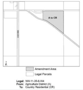 To consider an application to amend Land Use Order M.O. # MSL:007/15, Part VIII “Land Use District Map”, by re-districting 24.07+/- acres of the northeast corner of NW-11-35-06-W4, within Special Area No. 4, from “A” (Agricultural District) to “CR” (Country Residential District) as shown below: