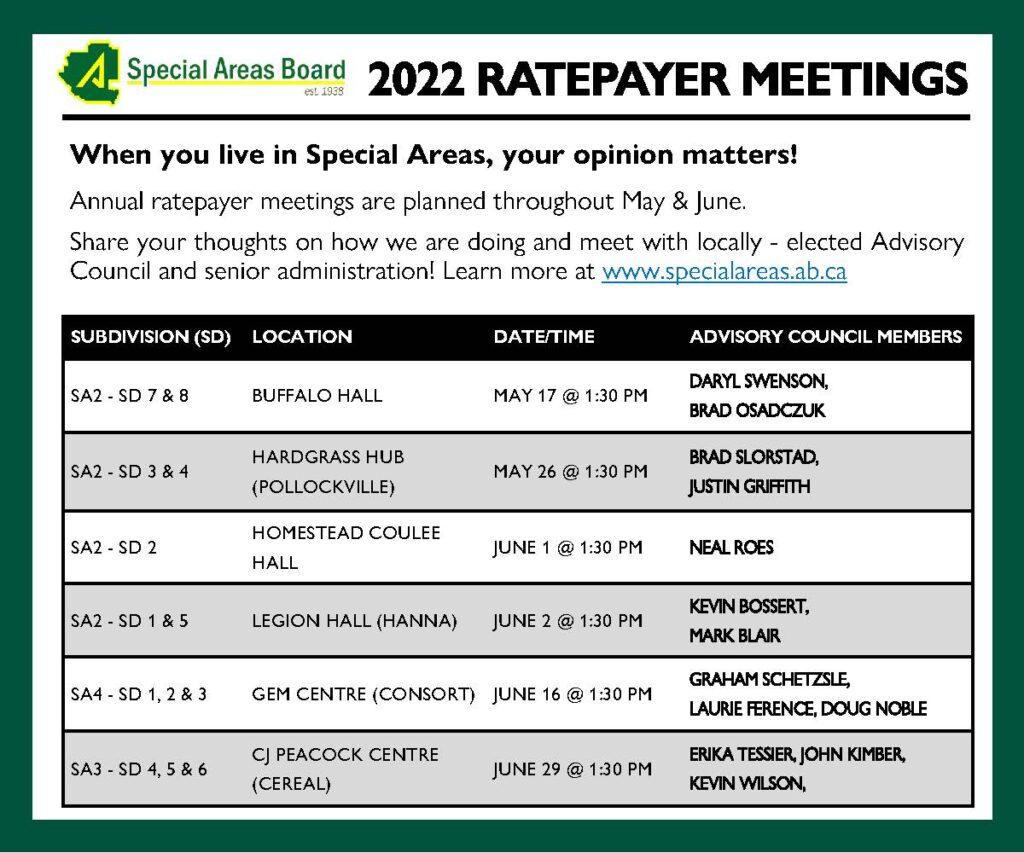 Advisory Council and staff will be touring much of the region May and June with 2022 ratepayer meetings. These public meetings give residents in Special Areas the chance to meet with Administration and Advisory Councillors right in their communities. Beginning each May, the annual ratepayer meeting “tour” translates to over 1,200 kilometers on the road.