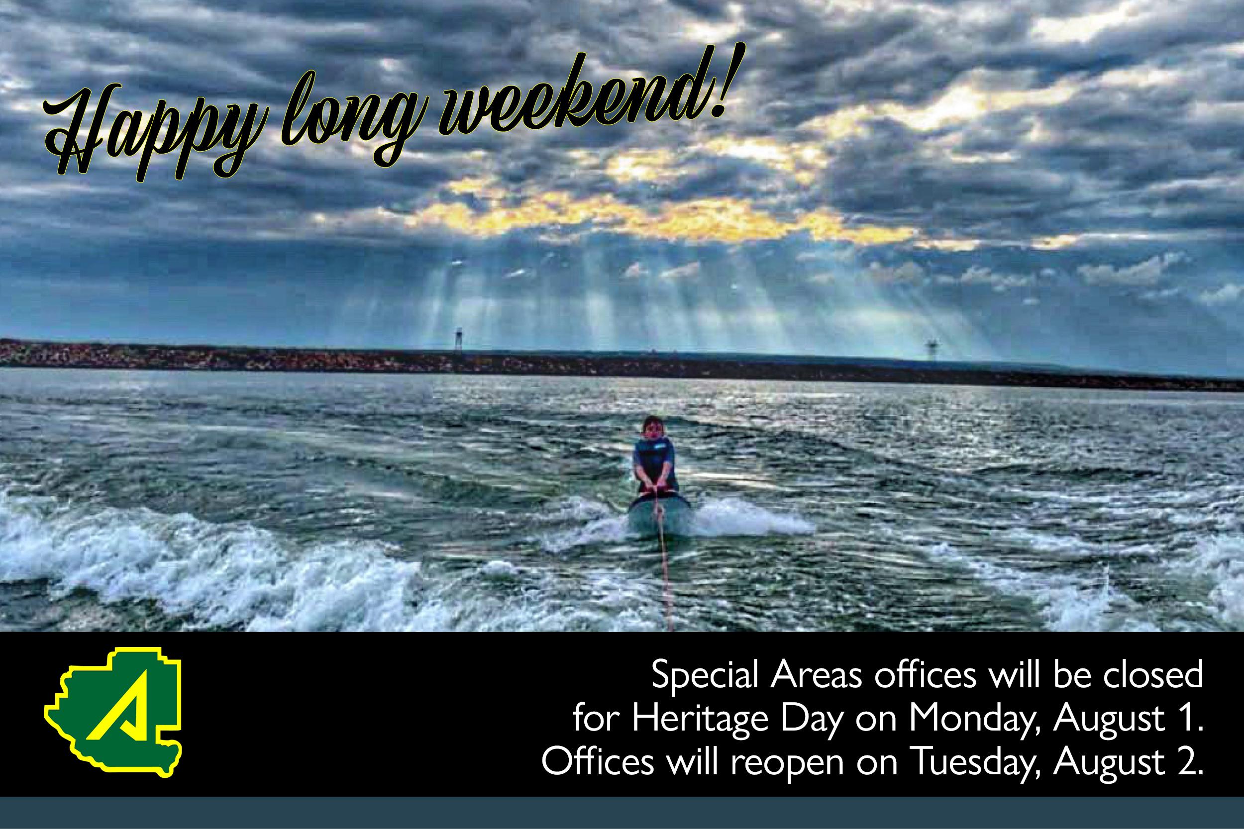Special Areas offices will be closed on Monday, August 1 in recognition of Heritage Day. Offices will reopen with normal business hours on Tuesday, August 2. Have a safe and happy long weekend, whether you are on the beach, enjoying the water, or just kicking your...