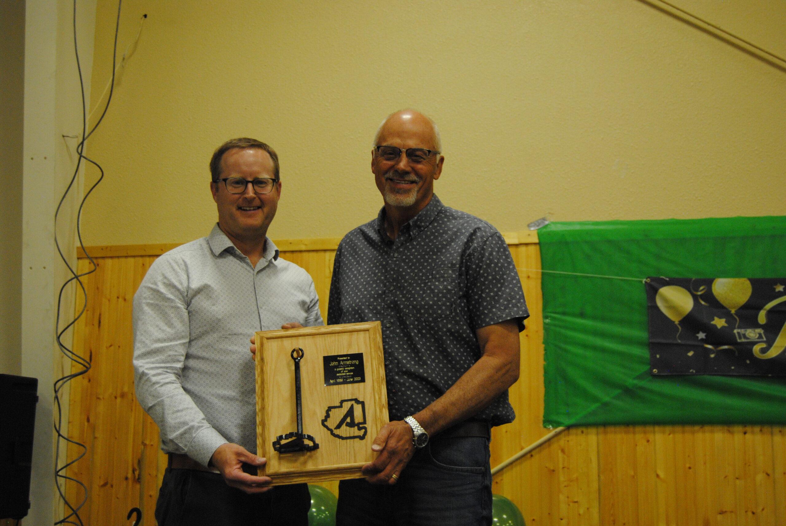 - Jordon Christianson presenting John Armstrong with Special Areas brand and plaque