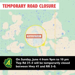 Township Road 31-4 will be temporarily closed between Highway 41 and Range Road 5-0 on Sunday, June 4 from 9 PM to 10 PM.