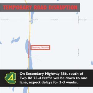 There will be a temporary traffic disruption on Hwy 886, south of Twp Rd 25-4. Repairs are being made on a 1 km stretch and traffic will be down to one lane. You can expect delays for 2-3 weeks start.
