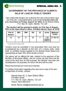Take notice that tenders are invited for the sale of land within Special Area No. 3 described below and will be received until 4:30 p.m. local time on Friday, August 18, 2023, at the District Office.