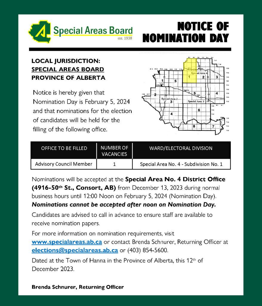 Special Areas is accepting nominations for the office of Advisory Council member for Special Area No. 4 – Subdivision 1.