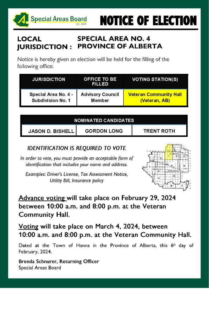 An election has been declared for the office of Advisory Council member for Special Area No. 4 – Subdivision 1.