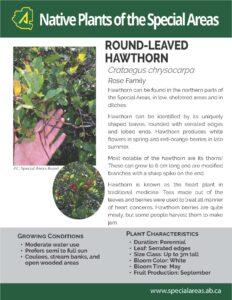 Hawthorn can be found in the northern parts of the Special Areas, in low, sheltered areas and in ditches. It is a shrub that can grow to 3 m tall.