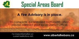 The Special Areas Board advises extreme caution and that only necessary burning should take place. The public is asked to ensure all fires are attended to and completely extinguished before leaving unattended.