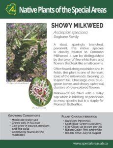 A common sight along Highway 555, showy milkweed is a showstopper when in bloom. A robust plant growing 1m or more in height with large 15 cm succulent green-blue leaves in an opposite arrangement on the stem.  Flowering starts in late July when showy milkweed produces a beautiful pink and white ball of flowers which turn into a very distinctive pod filled with fluffy seeds in the fall.