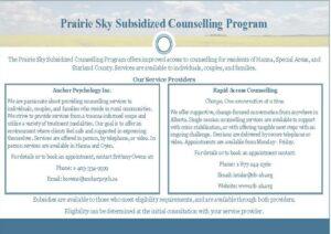“The rebranding to Prairie Sky Subsidized Counselling Program represents our commitment to making mental health support accessible to everyone in our community. We believe that everyone deserves the opportunity to heal and grow, and this program ensures that financial barriers won’t prevent anyone from seeking help.” said Peggy Rehill, Hanna Agricultural Society.