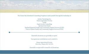Prairie Sky Subsidized Counselling Program is managed by a dedicated group of partners that include Town of Hanna, Special Areas, Starland County, Hanna Agricultural Society, Lynks, and Anchor Psychology, the program’s therapy provider. Recently, Starland County joined the program as a funder, further extending its capacity to reach more individuals in need. The Town of Hanna, Special Areas and Starland County contribute to the delivery of these services through direct financial contributions to the program. Lynks provides office space and the Hanna Ag Society does the record keeping, grant applications and has even added to the fund over the years when a shortfall was apparent.