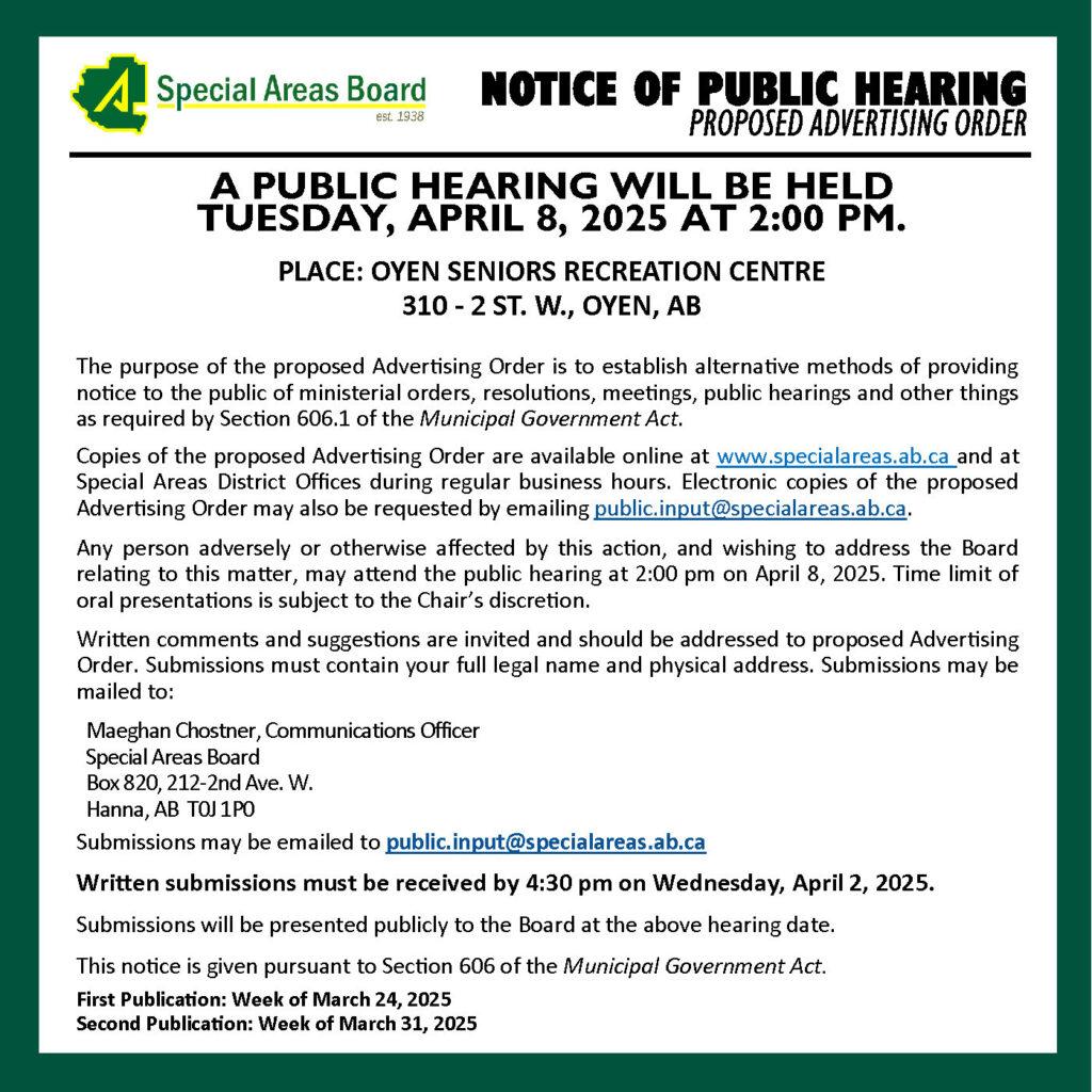 The Special Areas Board is holding a public hearing on Tuesday, April 8 at 2:00 pm in Oyen, AB at the Oyen Seniors Recreation Centre (310 – 2 St. W.).