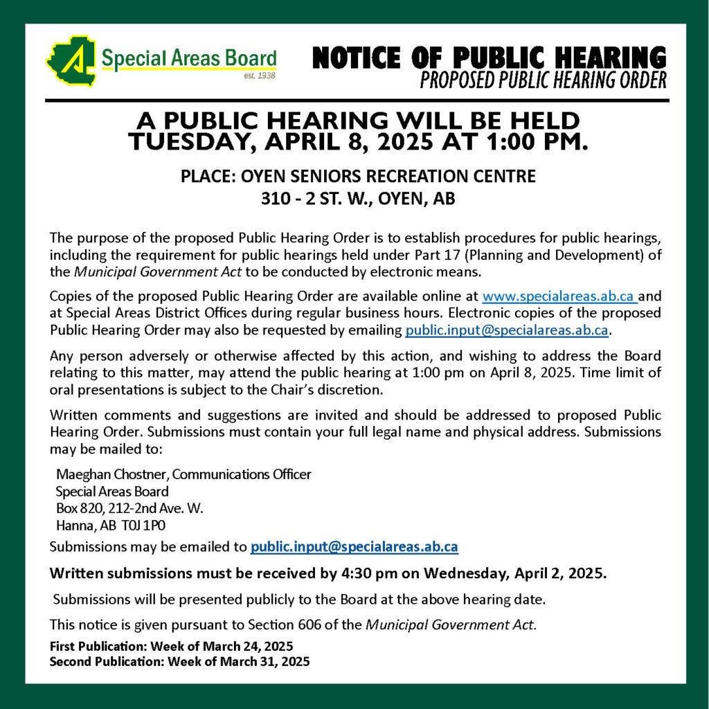 The Special Areas Board is holding a public hearing on Tuesday, April 8 at 1:00 pm in Oyen, AB at the Oyen Seniors Recreation Centre (310 – 2 St. W.).
