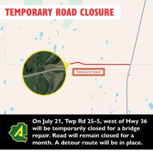 On July 21, TWP 25-2, west of Hwy 36 will be temporarily closed for a bridge replacement. This closure is expected to last a month.