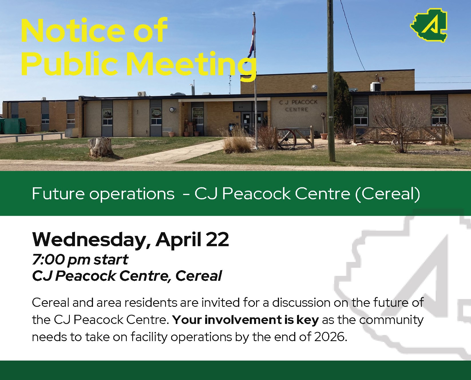 Special Areas is inviting Cereal and area residents to take an active role in an important community conversation about the future of the CJ Peacock Centre. A public meeting will be held on Wednesday, April 22 at 7:00 pm at the CJ Peacock Centre in...
