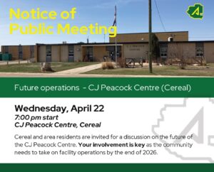 Special Areas is inviting Cereal and area residents to take an active role in an important community conversation about the future of the CJ Peacock Centre. A public meeting will be held on Wednesday, April 22 at 7:00 pm at the CJ Peacock Centre in Cereal, and all residents are encouraged to attend.
