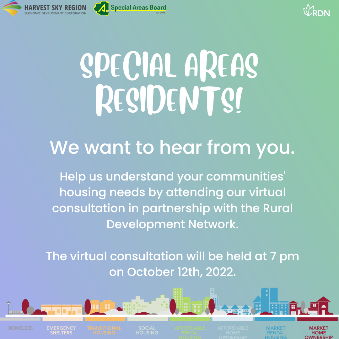 The Rural Development Network (RDN) Sustainable Housing Initiative is working on behalf of the Special Areas Regional Economic Development and Harvest Sky Region Economic Development to gather community perspectives regarding affordable housing in the Special Areas and surrounding communities. To understand the housing situation in...