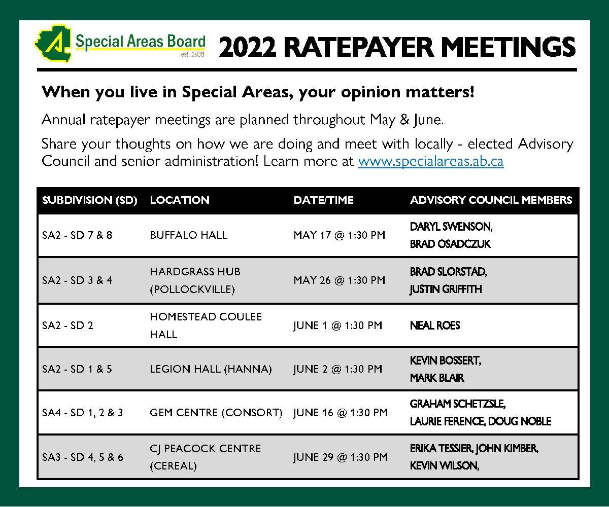 Special Areas Advisory Council and Administration are excited to be back in-person for ratepayer meetings! Advisory Council and staff will be touring much of the region May and June with 2022 ratepayer meetings. These public meetings give residents in Special Areas the chance to meet with...