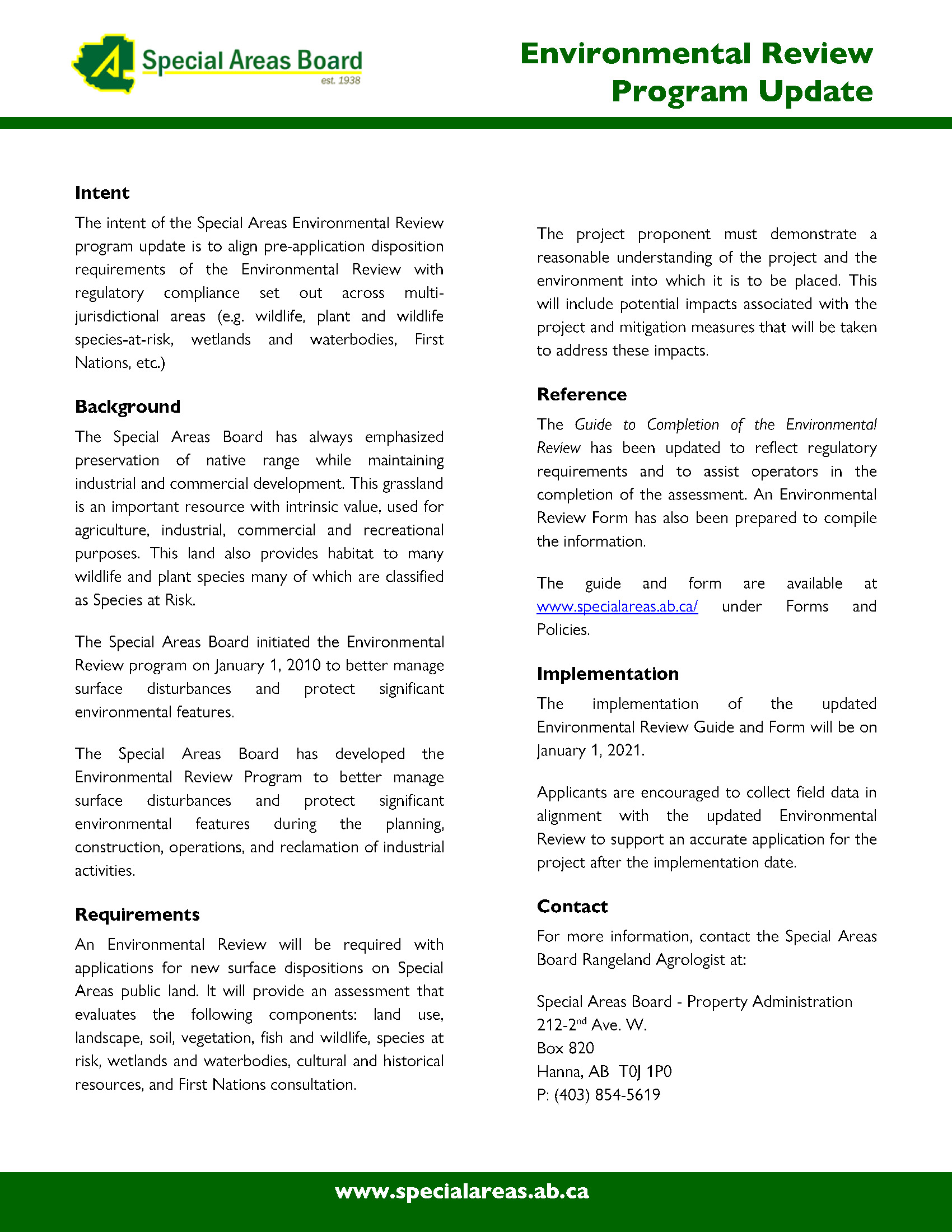 The updated Environmental Review Form is now available for use or applications for new surface dispositions located on public lands in the Special Areas. For more information on this update, you can view the updated fact sheet. The Environmental Review Program, in place since 2010, was...