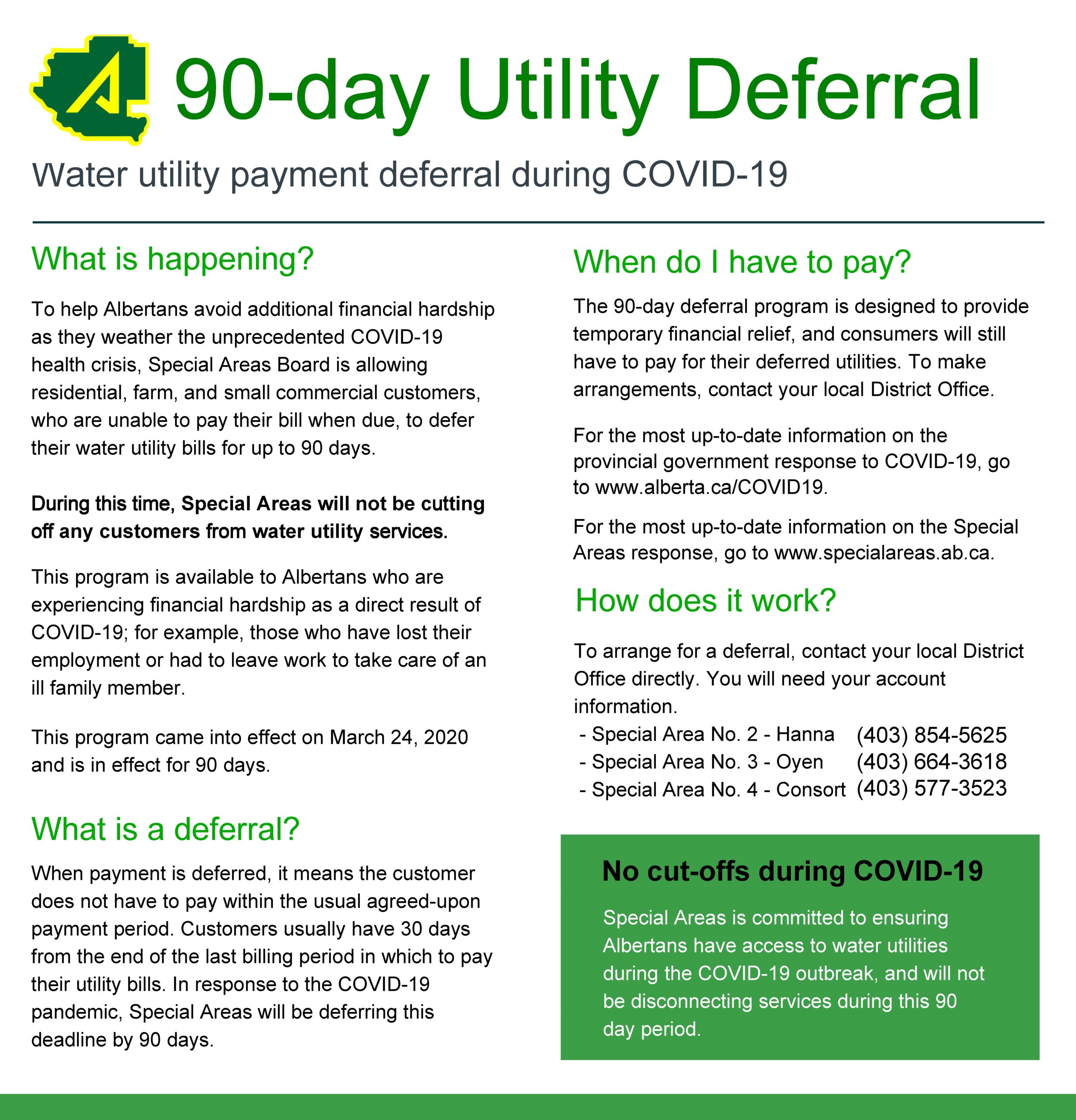 New financial relief measures for Special Areas water utility users were approved by the Special Areas Board, and will be in effect as of March 24, 2020. Water utility customers who receive invoices from the Special Areas for potable water will be able to request...