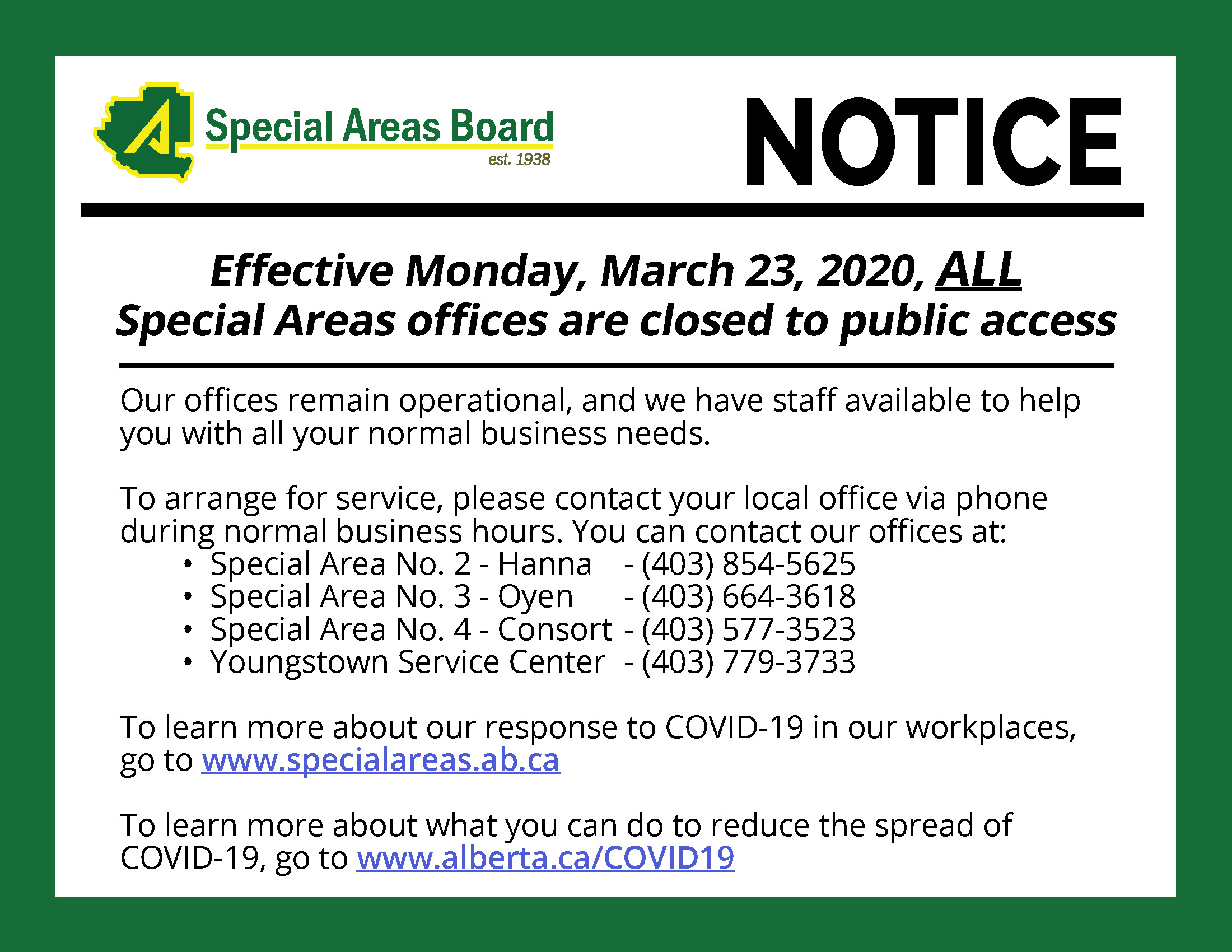 A quick update on how we are responding to the COVID-19 situation at the Special Areas Board. Our focus right now is protecting and maintaining the critical core services residents and ratepayers rely on. We have activated our pandemic business continuity team and continue to actively...