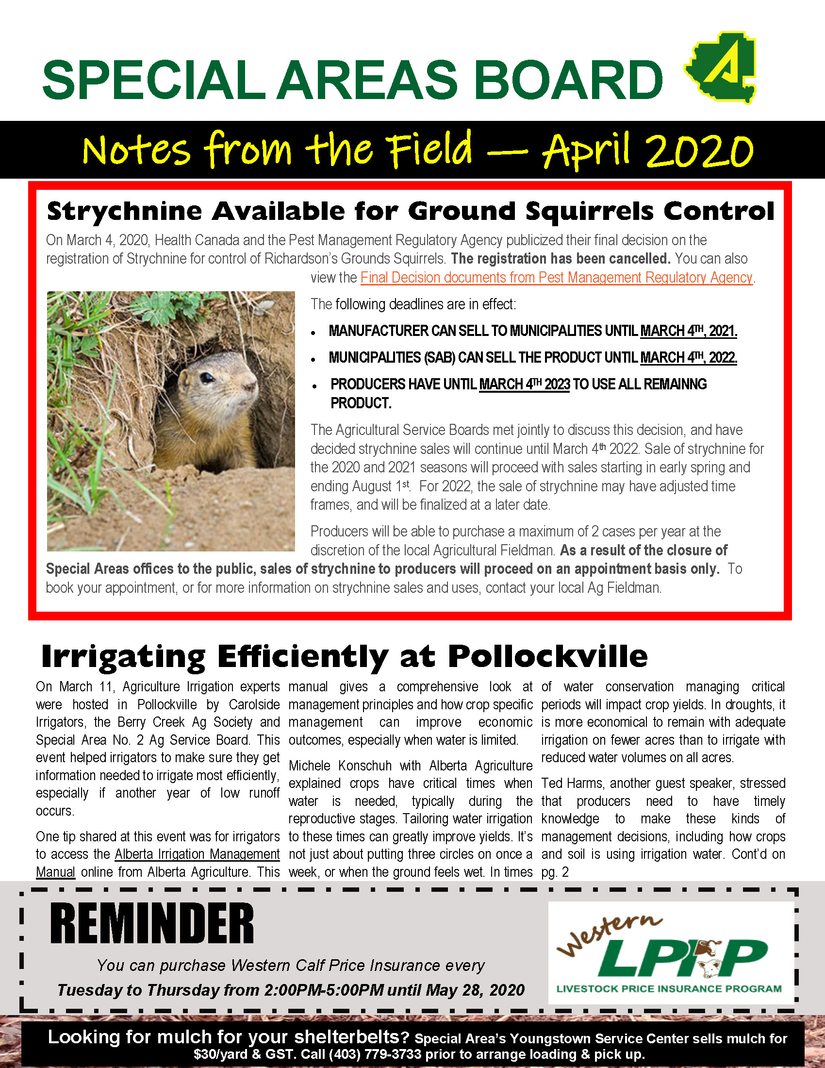 The 2020 spring edition of the Special Areas Board Ag newsletter is now available here. This edition dives into tips and information for producers, including: Strychnine available for ground squirrel control Irrigating efficiently - Alberta Agricultural tools Value-added Beef training - what's the payoff for producers? Watch out! Noxious weeds...
