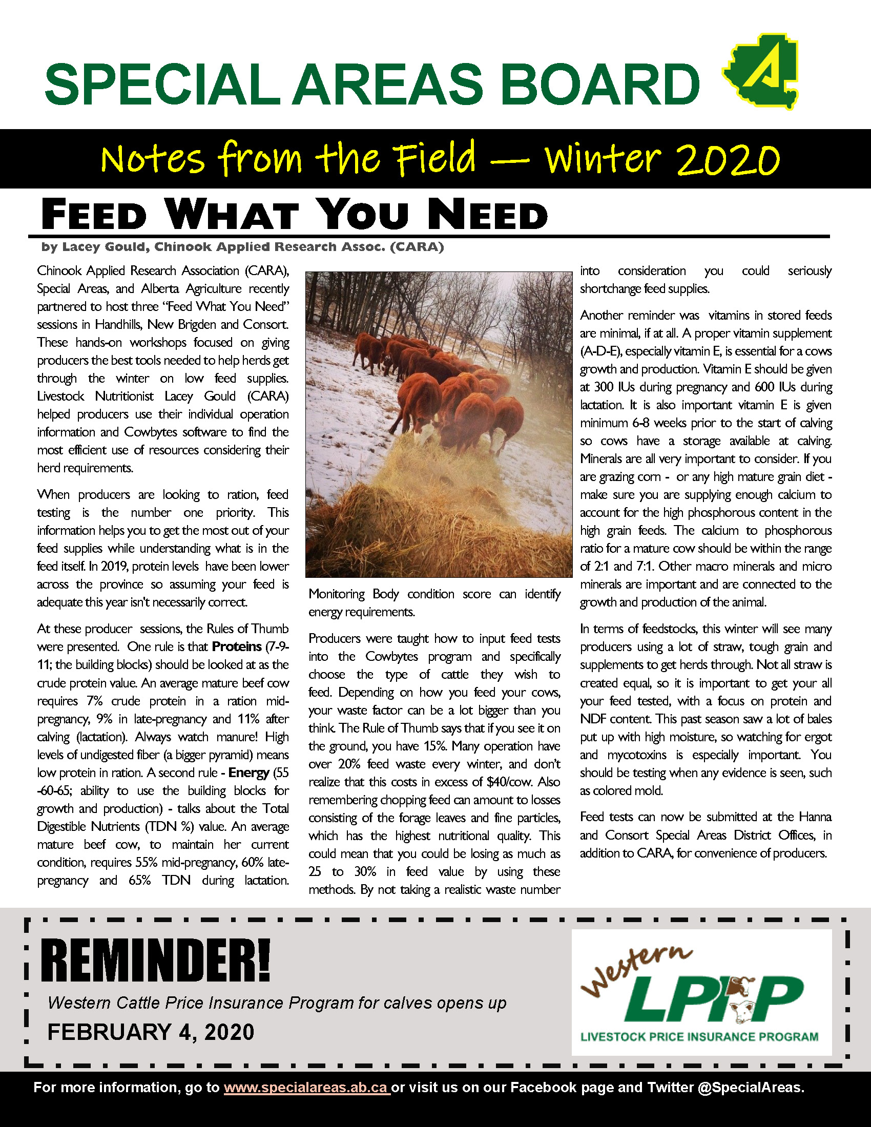 The 2020 winter edition of the Special Areas Board Ag newsletter is now available! This edition dives into tips and information for producers, including: Feed testing and winter feed planning Ag plastic recycling in the Special Areas Coyote controls and ASB supports Proposed changes to livestock traceability Bin monitoring and...