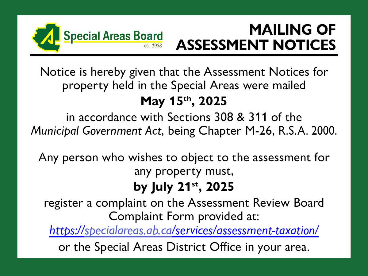 Assessment Notices for property held in the Special Areas were mailed May 15, 2025 in accordance with Sections 308 and 311 of the Municipal Government Act, being Chapter M-26, R.S.A. 2000. Any person who wishes to object to the assessment for any property must by July...