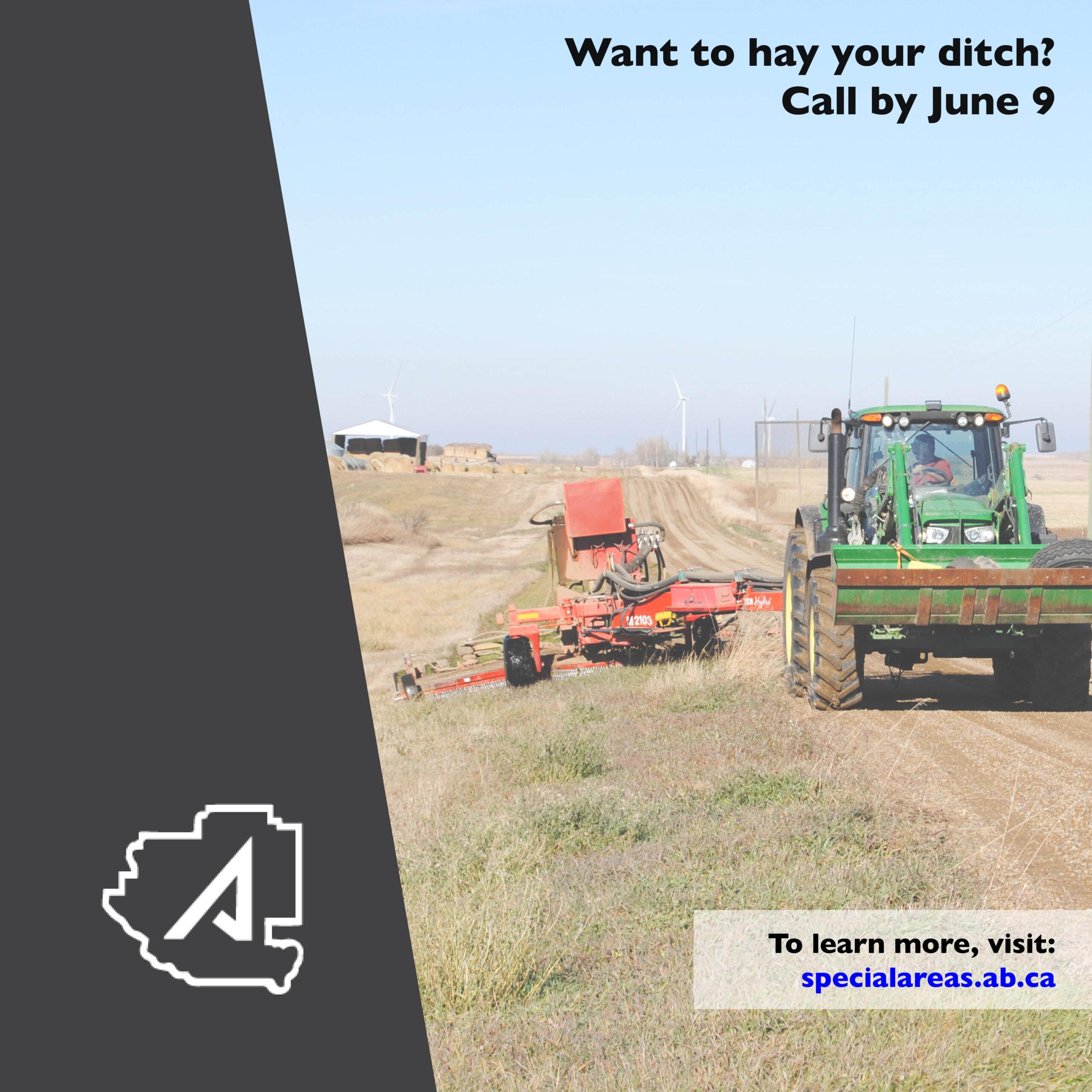 Special Areas roadside grass control (cutting ditches) for local roads will begin on June 9. Requests to hay your ditch must be submitted to your local District Office as soon as possible. This will allow our road crew to plan their work accordingly. Roadside grass control...