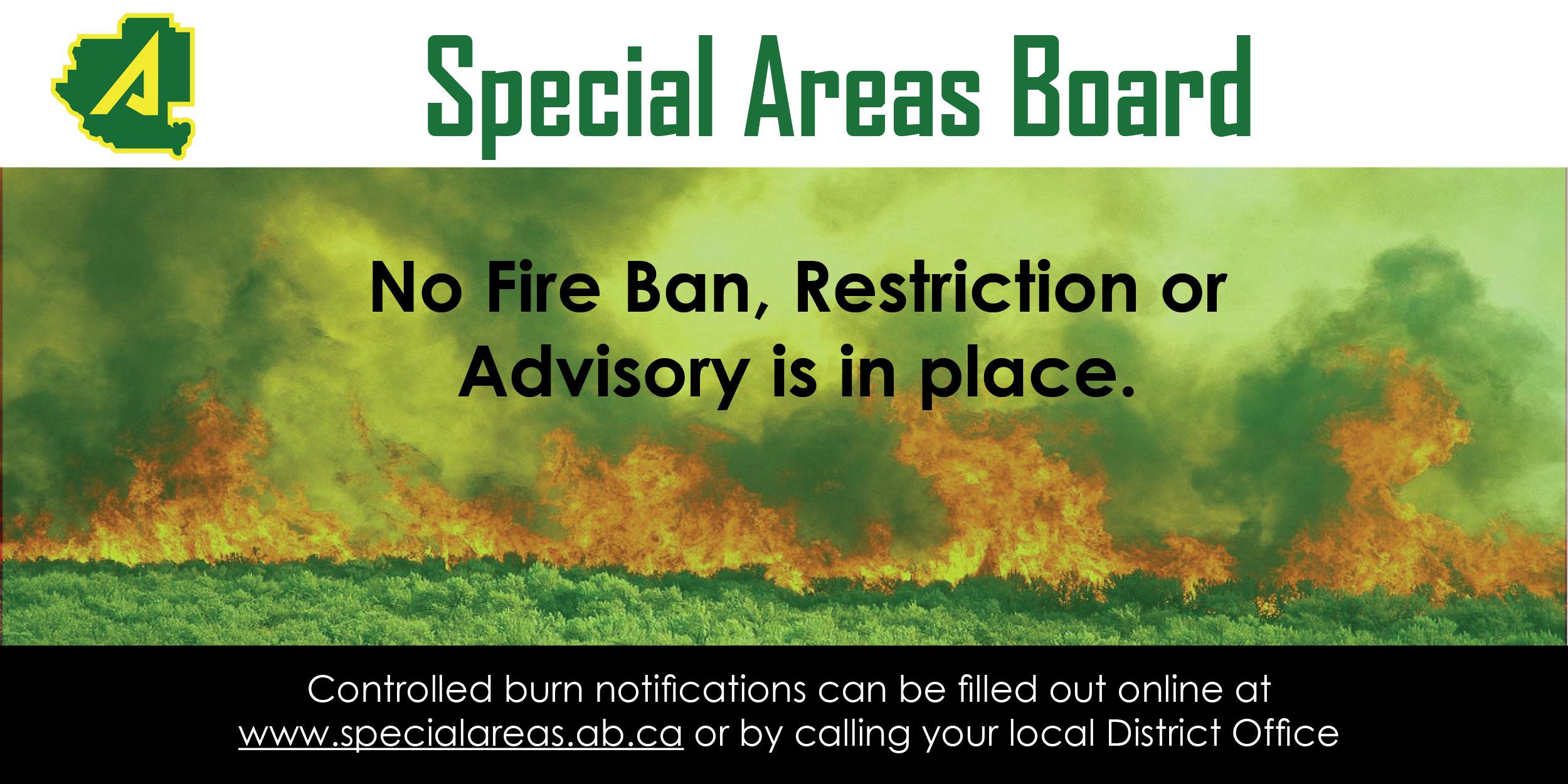Effective October 25, 2024 the Fire Advisory in the Special Areas is lifted. There is No Fire Restriction. Controlled Burn Notifications are required for any type of burning, except campfires and incinerator fires. Safe campfires are allowed in campgrounds and random camping areas....